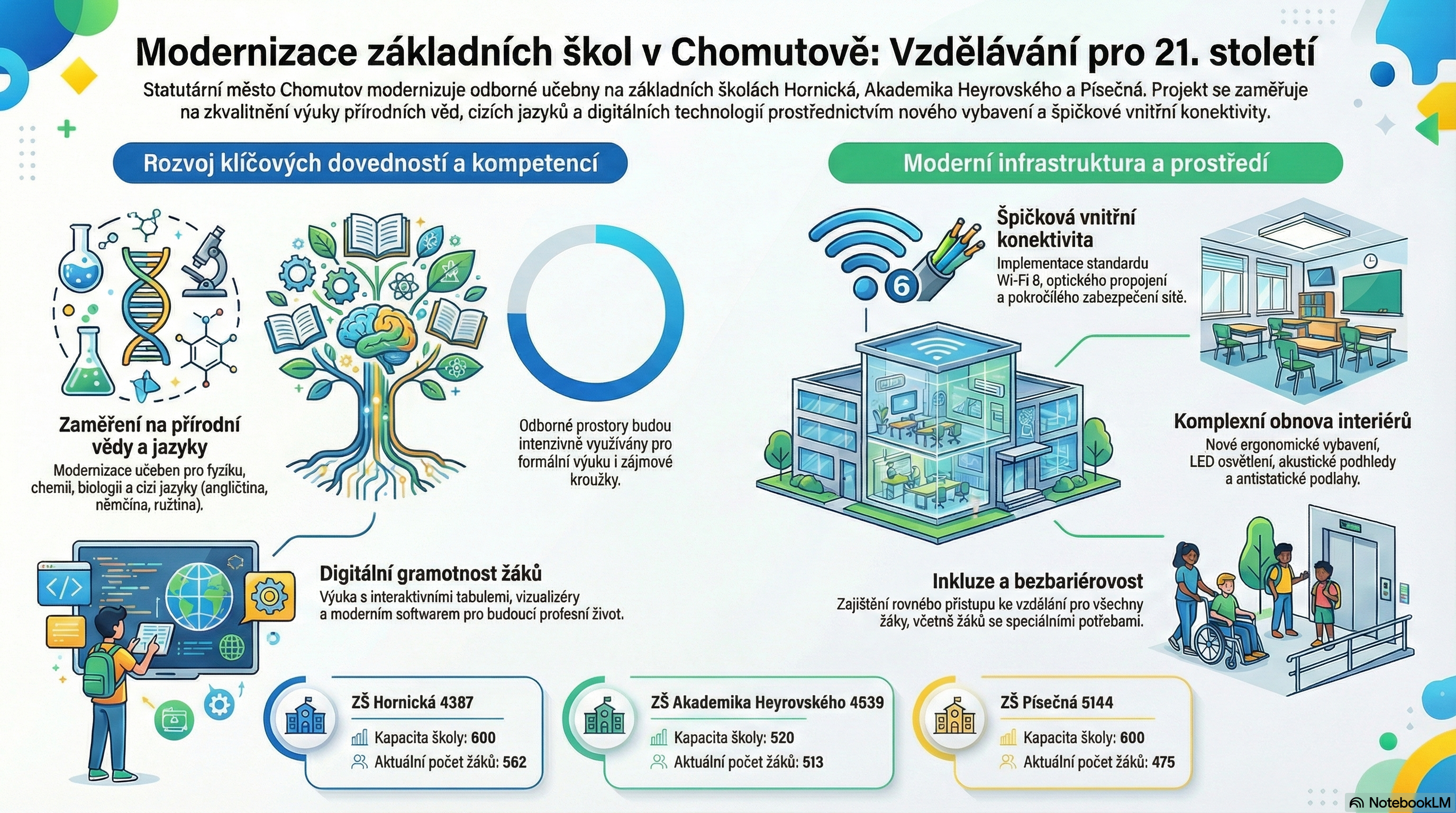 Statutární město Chomutov pokračuje v systematické modernizaci základních škol a v průběhu února 2026 zveřejní na profilu zadavatele zadávací dokumentace k navazujícím veřejným zakázkám v oblasti vzdělávací infrastruktury v prvních třech základních školách – ZŠ Hornická, ZŠ Akademika Heyrovského a ZŠ Písečná.